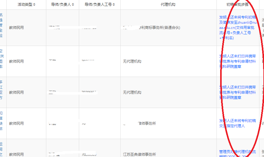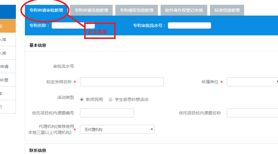 步骤1、专利申请审批(专利申请审批新增)相当于原线下流程中的填写“专利申请审批表”及对应审批流程;请准确填写活动类型(教师民用、学生奇思妙想活动)、依托项目校内课题编号、专利代理机构等信息,确保无误。