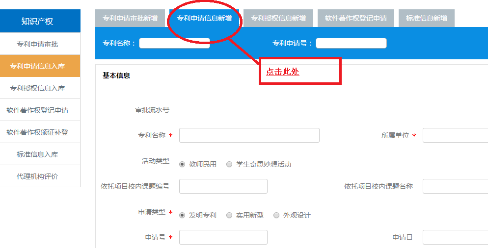 专利申请信息入库(专利申请信息新增)是指项目负责人在取得专利申请号后登记相关信息。其中可根据关键词自动从专利申请审批库中获取已填信息,获取后请仔细核对并修改。请先进行专利申请审批后登记申请信息。