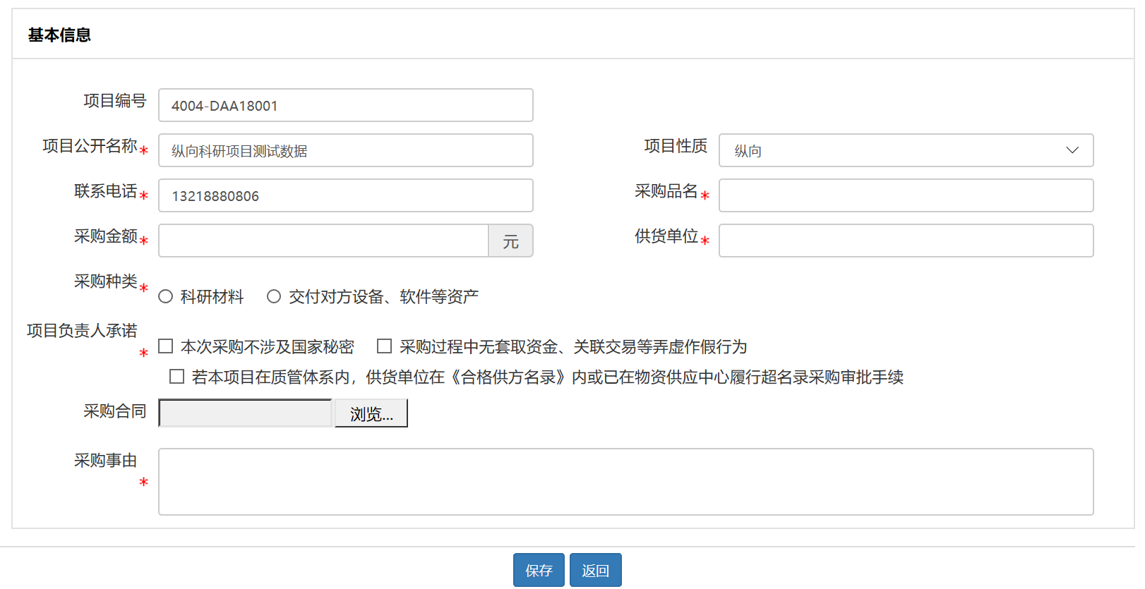 2.填写“采购品名、采购金额、供货单位、采购种类、采购是由”,并上传采购合同: