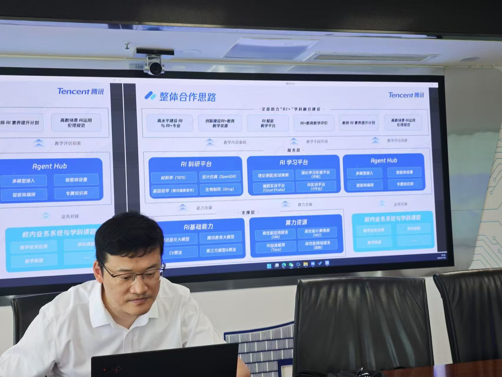 徐晓瑀介绍了腾讯教育平台在AI教学和科研上的适用场景,重点介绍了AI课程和实训资源,并希望双方在多维度上增强合作、互利共赢,推动AI教育与科技的创新融合,共同迈向更高层次的发展。
