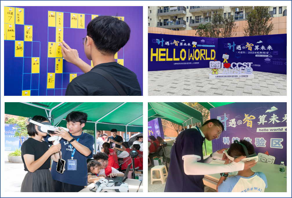同时,迎新现场搭建“创意签到墙”,每位新生领取一张喔喔贴纸粘贴到签到墙上,全体新生用贴纸拼接出“Hello World”语句,共同开启人生的全新篇章,收获满满仪式感;为让新生在迎新活动中感受计算机技术的独特魅力,提升学习兴趣,学院还在报到点设置“喔喔”立牌,VR设备体验区,“喔喔快跑”“喔了个喔”游戏体验等活动,以游戏的形式寓教于乐。