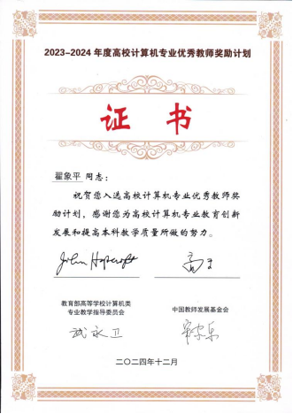 2024年12月7日-8日,2024中国计算机教育大会(CECC2024)在厦门召开,并在大会上隆重举行了2023-2024年度“高校计算机专业优秀教师奖励计划”颁奖典礼,我院翟象平老师入选该计划。