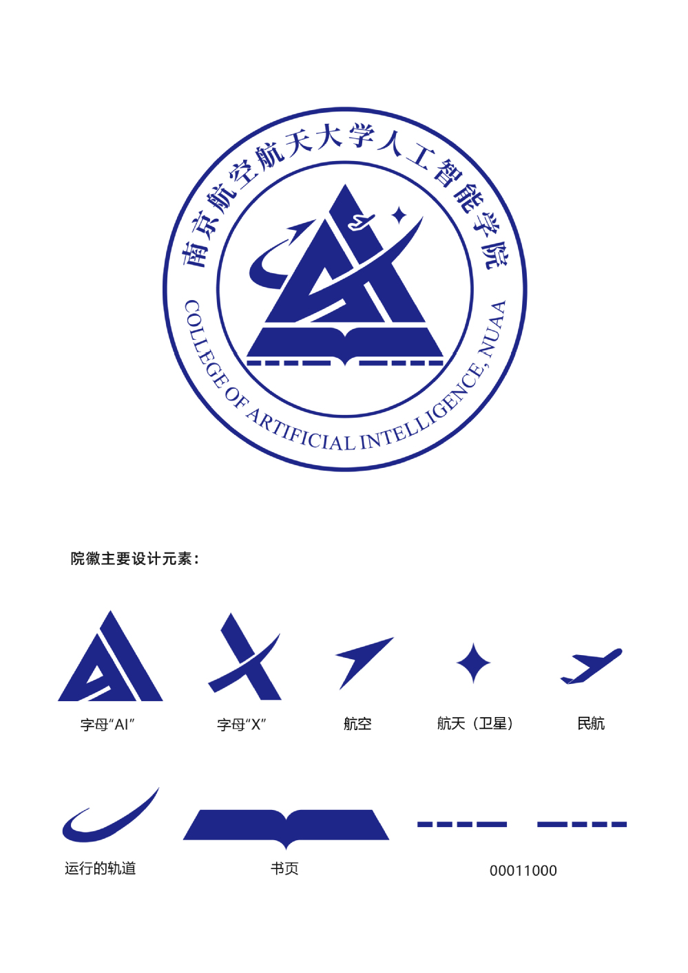 整体构图:院徽的整体构图融合“人工智能”英文首字母“AI”、字母“X”、航空、航天(卫星)、民航以及运行轨道(弧线部分)等多元元素。这一设计不仅生动诠释了学院“特色引领、交叉融合”的建设思路,更是学院面向航空、航天、民航“三航”领域,深度探索“AI+X”与“X+AI”多学科交叉发展模式的鲜明映照。