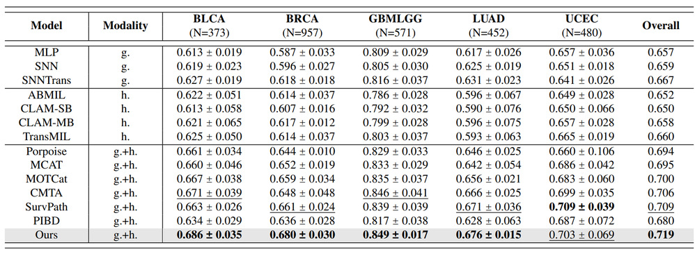 2024级博士生周俊杰,在邵伟和张道强的指导下,以第一作者发表了论文《Robust Multimodal Survival Prediction with the Latent Differentiation Conditional Variational AutoEncoder》。该论文提出了一种基于潜在分化条件变分自编码器(LD-CVAE)的鲁棒多模态生存预测方法,旨在解决基因组数据缺失情况下的癌症生存预测问题。针对现有方法通常假设所有模态数据完整可用,而实际中基因组数据采集成本高、测试样本中可能缺失的问题,该方法通过从病理图像生成基因组表示来应对数据不完整性。然而,这一策略面临两大挑战:(1)全病理切片图像(WSIs)数据量大,难以有效表示;(2)在统一的生成框架下生成具有多样化功能类别的基因组嵌入具有挑战性。研究提出通过变分信息瓶颈Transformer模块从WSIs中学习压缩的病理表示,并利用潜在分化变分自编码器生成具有不同功能的基因组特征。最后,采用product-of-experts将基因组后验和图像后验整合,用于联合潜在分布估计。在五个不同的癌症数据集上的实验结果表明该方法在完整模态和缺失模态场景下均表现出优越性,验证了其有效性和鲁棒性。