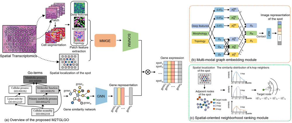 2023级硕士生石航,在365上市公司副教授邵伟的指导下,以第一作者发表了论文《Multi-modal Topology-embedded Graph Learning for Spatially Resolved Genes Prediction from Pathology Images with Prior Gene Similarity Information》。该论文提出一种基于多模态拓扑嵌入图学习的基因预测方法。该方法由三个核心模块构成:多模态图嵌入模块、空间邻域排序模块及基于先验基因本体知识的图神经网络模块。多模态图嵌入模块通过深入学习不同模态内部及模态间的特征交互,生成全面的图像块表示,从而增强特征的表达能力和判别性。空间邻域排序模块则通过保持节点间的空间拓扑关系,确保与目标节点空间距离较近的邻域节点在特征空间中的相似度得到加强,进而有效捕捉局部和全局空间依赖。基于先验基因本体知识的图神经网络模块通过挖掘基因间的功能相似性,结合基因本体的先验信息,优化基因表达的预测精度,从而提高模型的生物学推理能力。实验结果表明,M2TGLGO在多个公开数据集上表现出显著优于现有方法的预测精度,展示了其在空间转录组学数据分析中的广泛应用潜力。