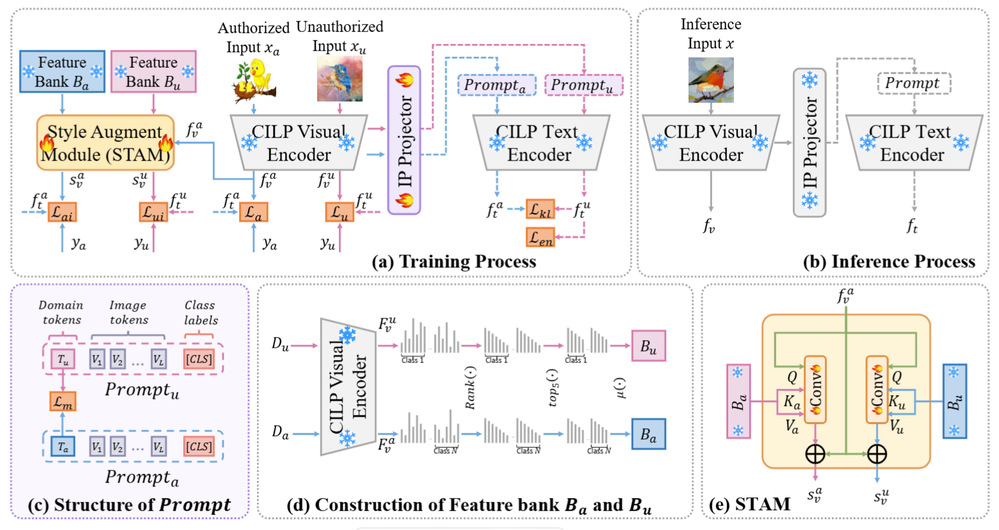 2023级博士生汪恋雨,在新加坡科技研究局研究员付华柱以及张道强的指导下以第一作者发表了论文《Vision-Language Model IP Protection via Prompt-based Learning》。论文提出了IP-CLIP,一种专为CLIP设计的轻量级知识产权保护策略。该方法通过提示学习和CLIP的冻结视觉骨干提取图像风格和内容信息,形成防止特征非法迁移的屏障。此外,引入风格增强分支,构建授权和非授权域的特征库,进一步加强保护能力。研究团队还提出了三项新指标,旨在更好地平衡授权域与非授权域之间的性能衰减。实验结果表明,IP-CLIP在多个场景下表现出色,为VLMs的知识产权保护提供了创新解决方案。