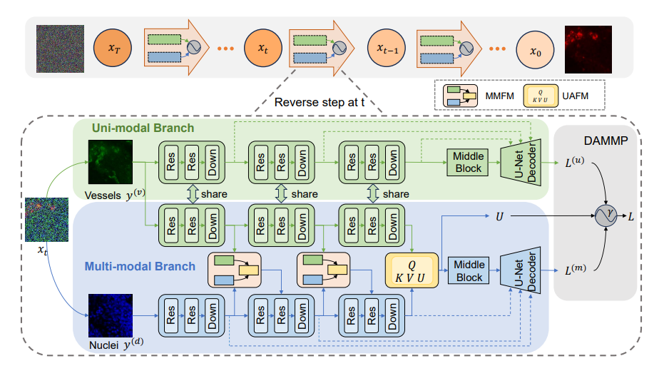 2024级博士生周俊杰,在南京医科大学教授王守巨、邵伟和张道强的指导下以第一作者发表了论文《DAMM-Diffusion: Learning Divergence-Aware Multi-Modal Diffusion Model for Nanoparticles Distribution Prediction》。该论文提出了一种发散感知多模态扩散模型,用于自适应地生成单模态和多模态分支的预测结果,以解决纳米颗粒(NPs)分布预测中的关键问题。纳米颗粒分布在肿瘤诊断和治疗中具有重要意义,而肿瘤微环境的异质性高度影响了NPs在肿瘤中的分布。然而,多模态TME组件之间的分布差异可能导致副作用,例如单模态模型可能优于联合生成模型。为此,研究团队提出了DAMM-Diffusion模型,通过统一网络结合单模态和多模态分支进行预测。具体而言,单模态分支采用U-Net架构,而多模态分支通过引入多模态融合模块MMFM和不确定性感知融合模块UAFM进行扩展。MMFM用于融合多模态特征,UAFM则通过学习不确定性图进行跨注意力计算。随后,发散感知多模态预测器模块评估多模态数据与不确定性图的一致性,以决定最终预测结果来自多模态还是单模态分支。实验结果表明,在给定肿瘤血管和细胞核的TME组件情况下,DAMM-Diffusion能够以更高的准确性生成NPs分布,优于对比方法。