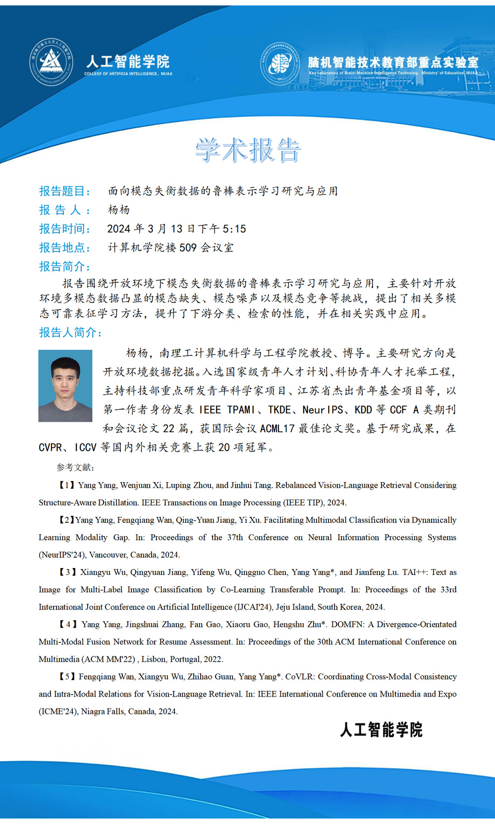 学术讲座:面向模态失衡数据的鲁棒表示学习研究与应用