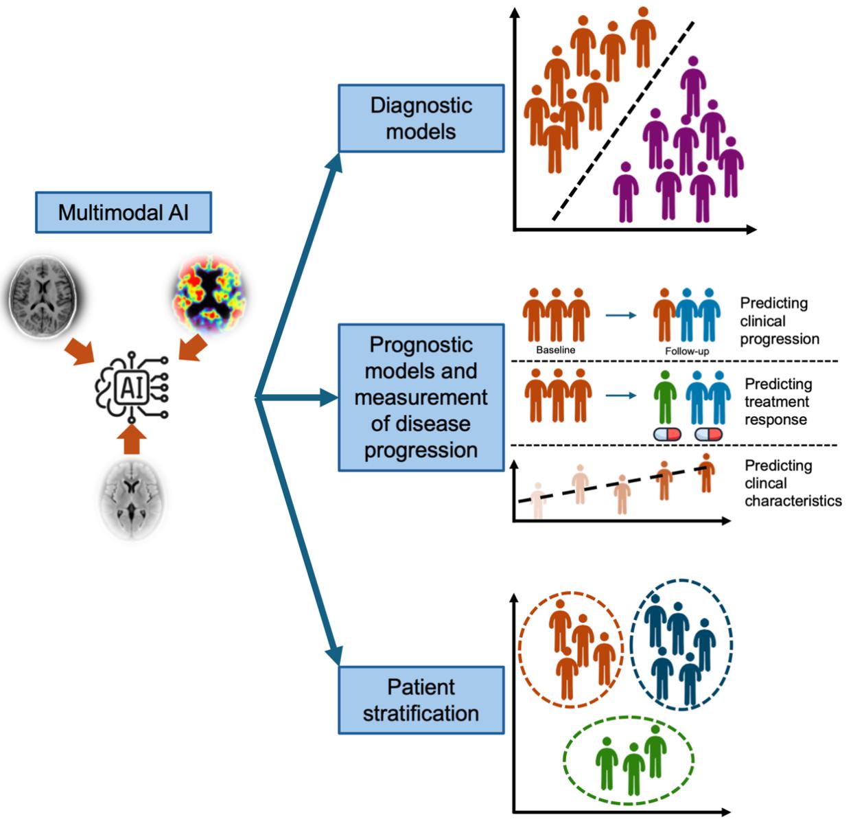 该论文系统总结了基于多模态神经影像的人工智能方法在神经精神疾病精准医学领域的最新研究进展,并对未来发展方向进行深入探讨。该研究首先将当前多模态AI方法在阿尔茨海默病、多发性硬化、精神分裂症、自闭症、抑郁症等常见神经精神障碍中的应用归纳为三大研究重点方向:疾病诊断、病程预测与预后评估、以及患者群体分层(见图1)。论文还聚焦该领域当前亟待解决的六项关键问题:数据资源的可获取性、模态间差异带来的异质性、模型结果的可解释性、样本类别不平衡、算法偏差问题及数据隐私保护等。作者针对每项挑战提供了潜在的技术路径与应对策略。最后,结合大语言模型等新兴AI工具的发展,作者展望了未来基于大数据的多模态影像分析如何推动神经精神疾病诊疗范式的革新。论文特别指出,在推动模型转化落地过程中,需构建更加注重临床实用性和效度的评估体系,避免仅以预测精度为最终目标。